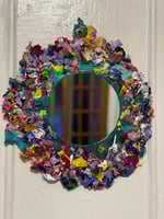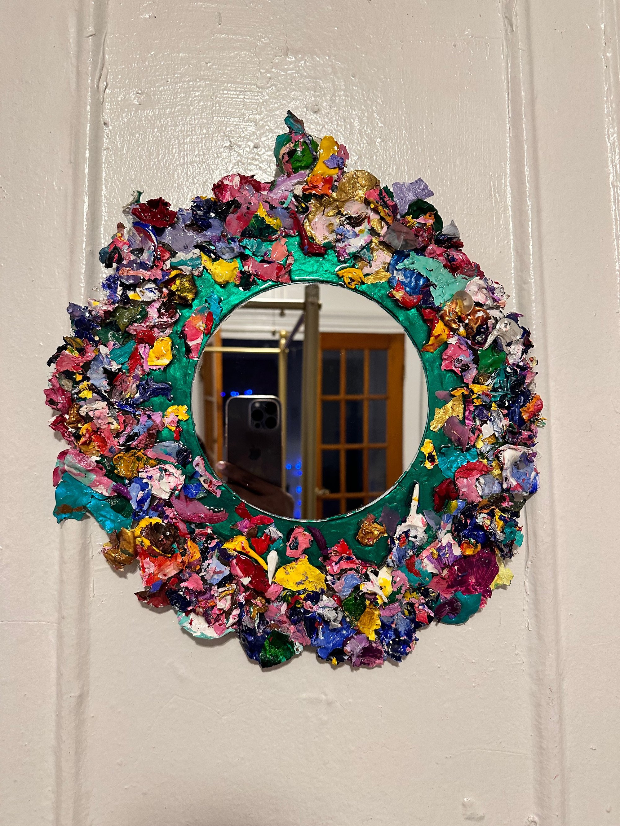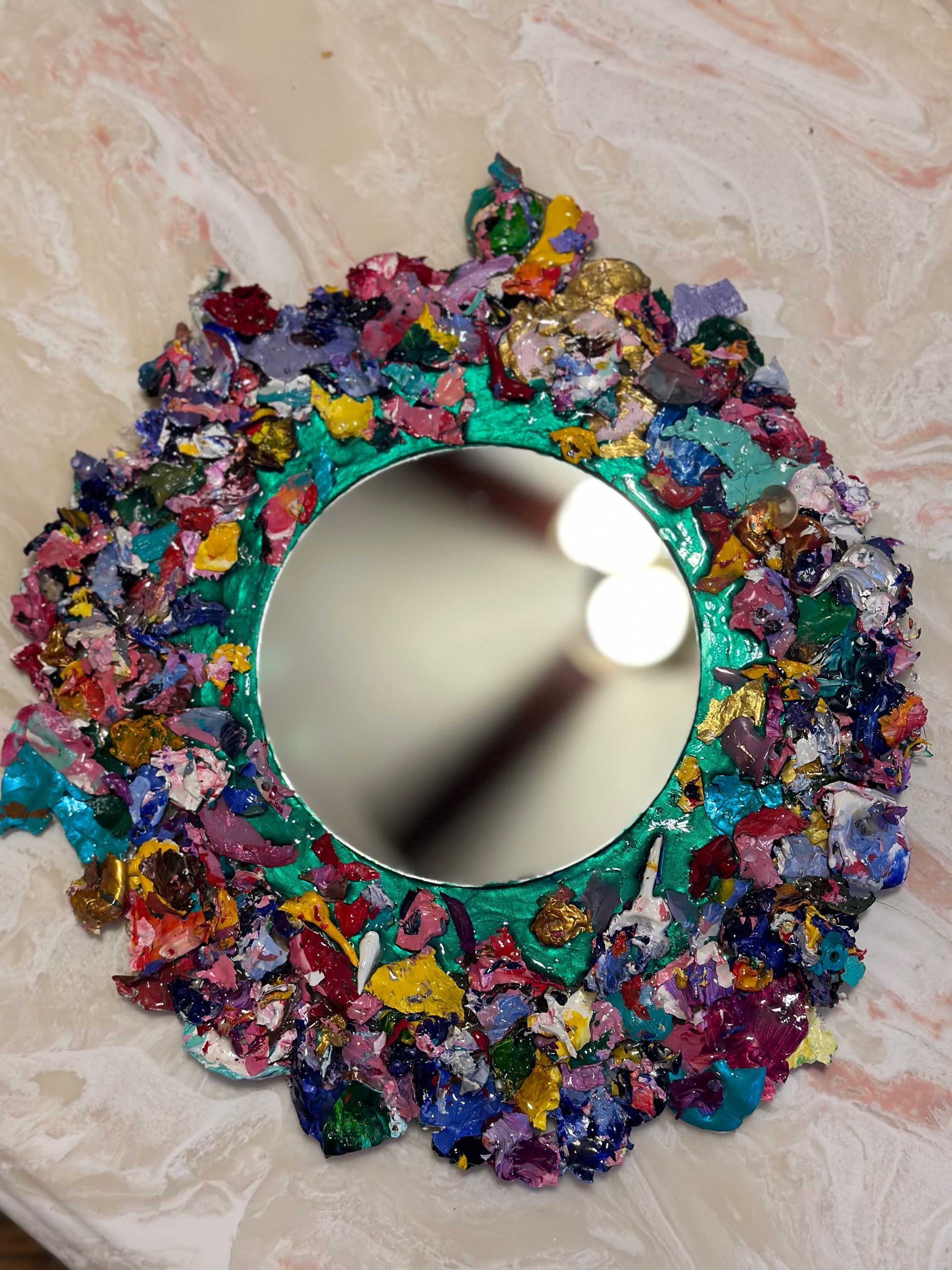 Hand crafted with recycled paint chips coated in resin for durability. This wall hanging mirror is 13.5 inches in total and features a 6 inch mirror. There are two hooks provided on the back to allow a view from different angles.